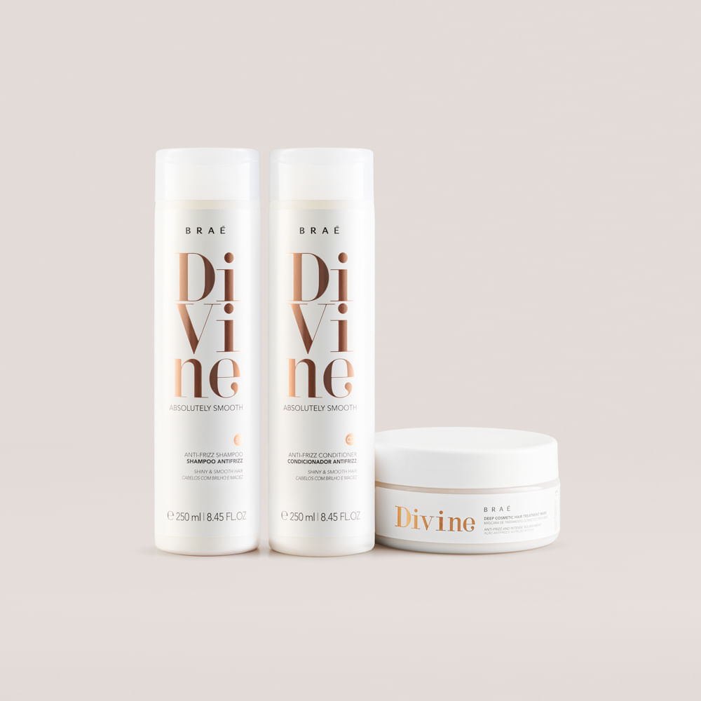 Kit Trio Divine Braé foi desenvolvido para promover controle duradouro do frizz, hidratação intensa e alinhamento natural dos fios.