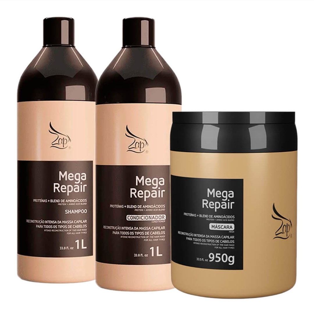 Kit Zap Mega Repair foi desenvolvido para promover a reconstrução intensiva da fibra capilar, devolvendo força, resistência e vitalidade aos cabelos danificados por químicas ou agressões externas.
